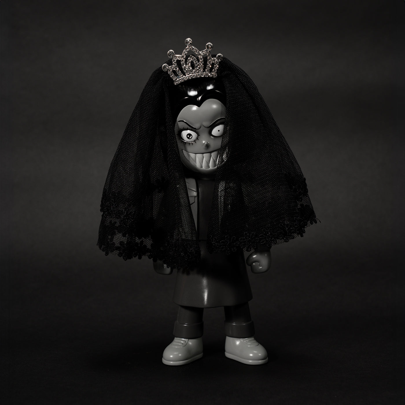After passing through the previous two parallel universes, the toy series of Lora in the third parallel universe has reached its final form. Lora has transformed into a zombie bride, wearing a gray veil. The "PUNK IS NOT DEAD" on her back emits a blue light when illuminated with ultraviolet light. This product includes a secret version of Lora that is randomly shipped, characterized by a black lace veil.