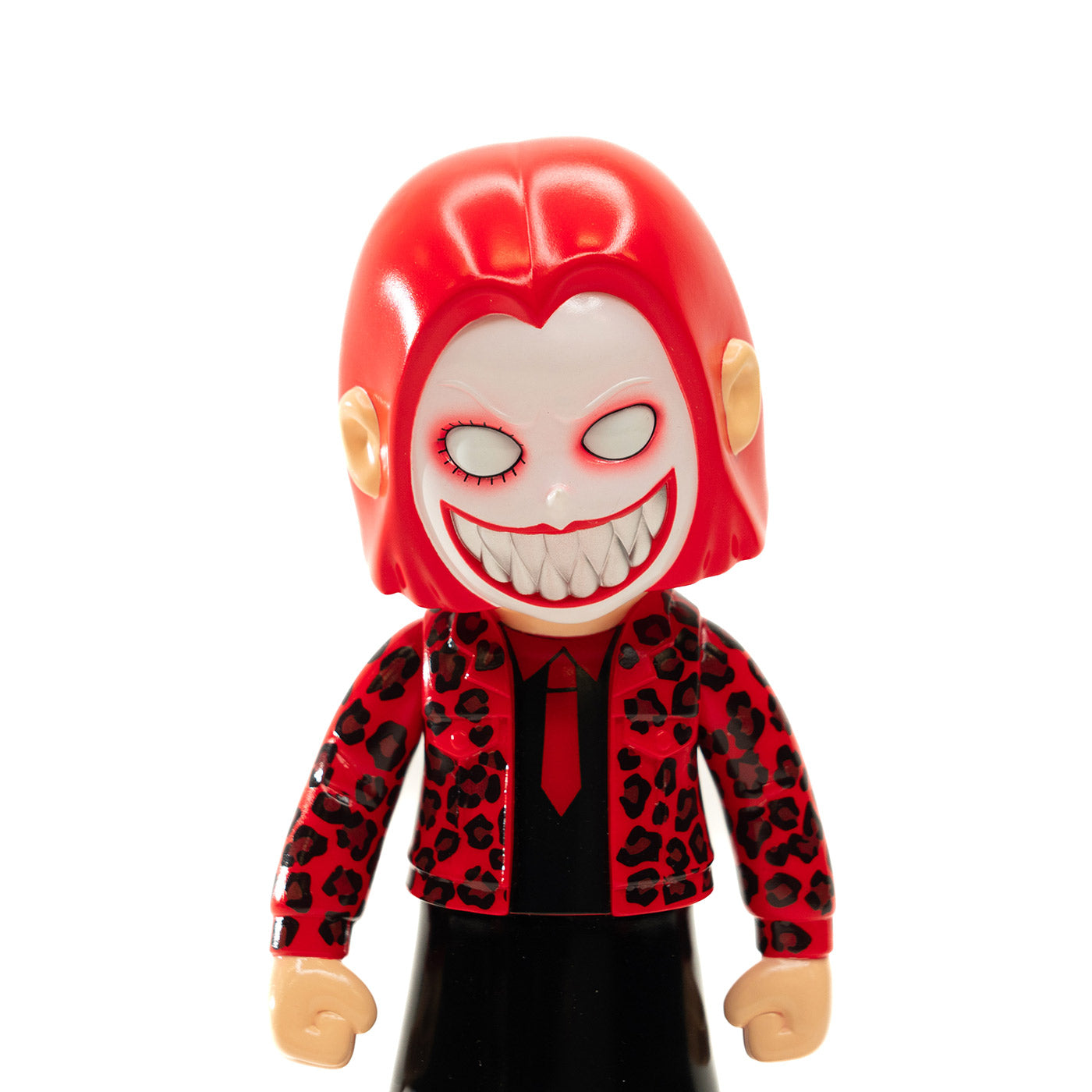 The second color scheme of the SOFUBI toy Lola in multiverse is inspired by American rock star Marilyn Manson and famous Japanese artist Yayoi Kusama. Marilyn Manson was the childhood rock music mentor of designer TenGuSan, while Yayoi Kusama is an artist with magical power. These two seemingly unrelated individuals share certain similarities, such as their strong, distinctive characters seen both in themselves and their respective works of art, as well as obsession and madness. They both have dyed their hair red, one has worn leopard print, and the other is adept with polka dots. Therefore, this Lola is named Marilyn Yayoi.