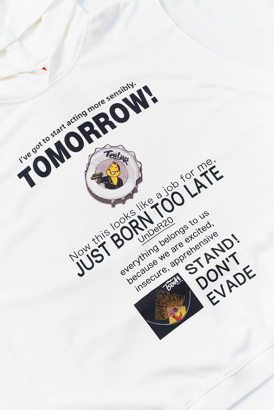 The graphic on the garment replicates Raf Simons' layout style while incorporating Tailer's diary entries: "I need to start acting more sensibly. Tomorrow!" "Now this looks like it was meant for me, just born too late" "Everything belongs to us because we're excited, insecure, apprehensive" "Stand! Don't evade." Perhaps you've said these things to yourself countless times?