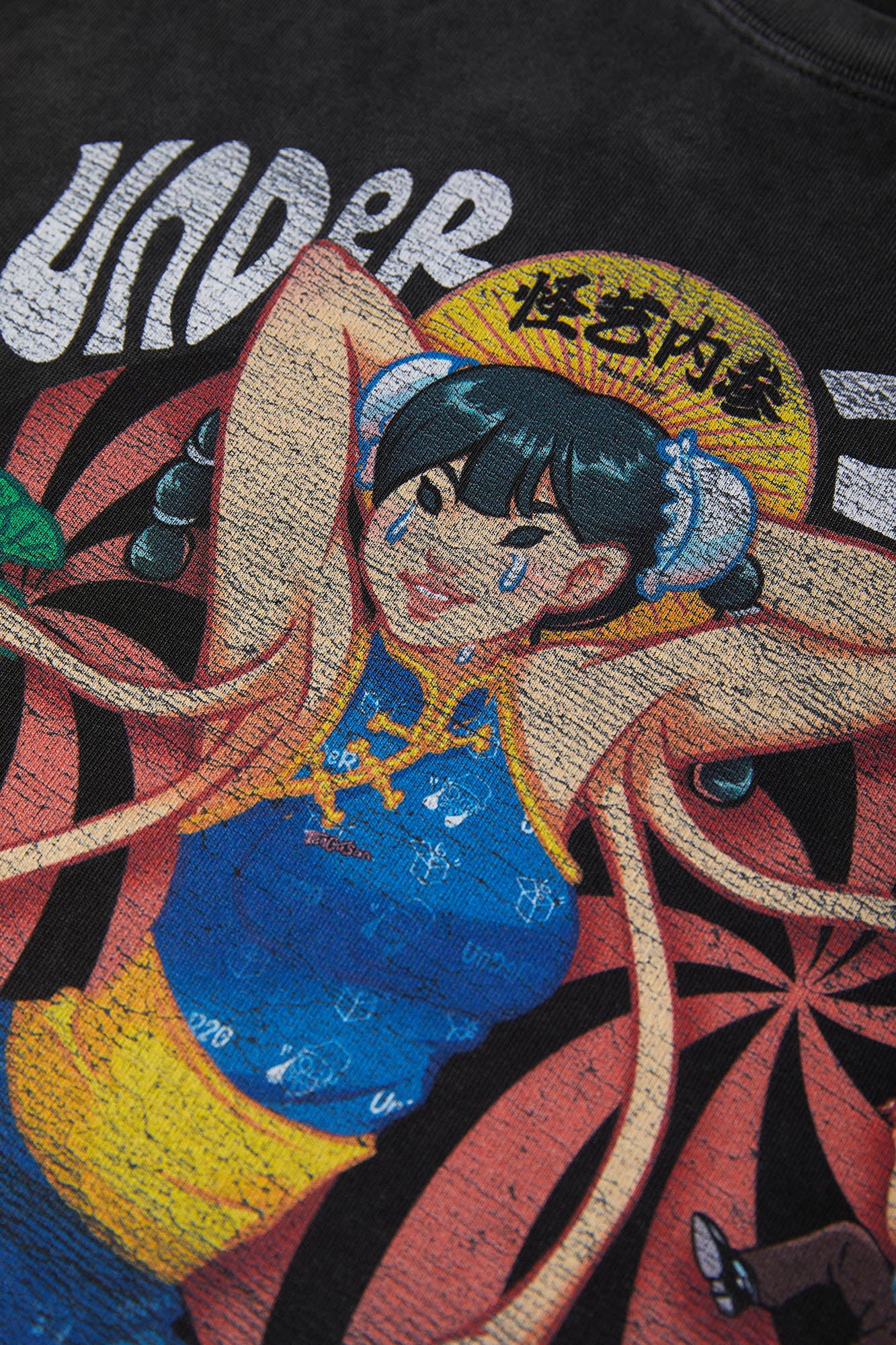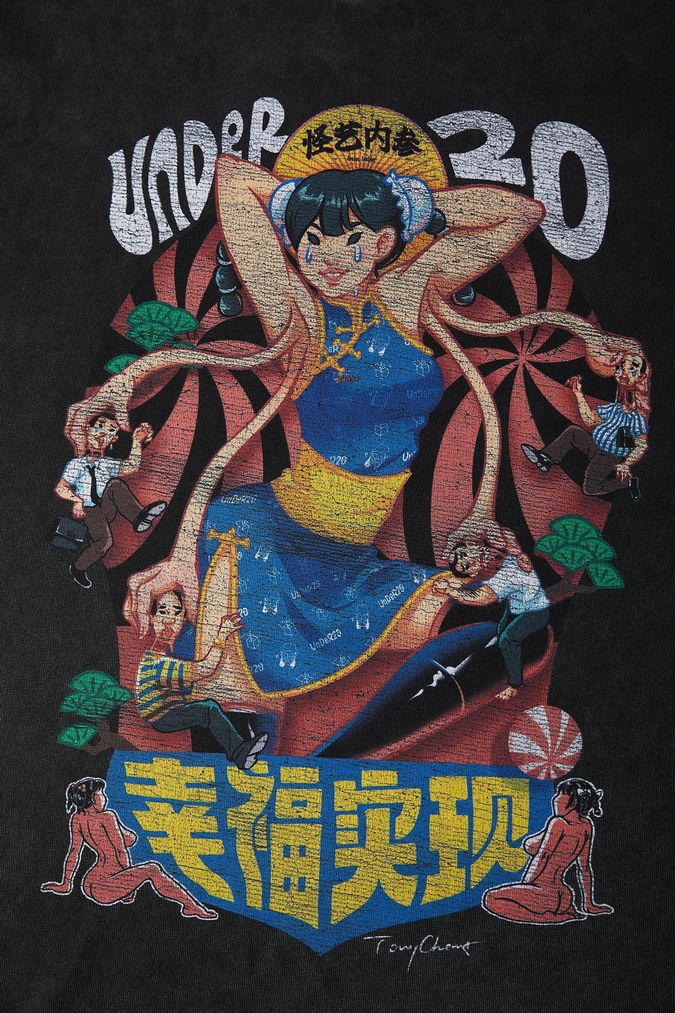For this collaboration, Tony Cheung created an entirely new piece. Drawing inspiration from the iconic Chun-Li from Street Fighter, the artwork features multiple tentacles extending from Chun-Li’s underarm, gripping several men with distinct and exaggerated features. This imagery subtly hints at the inescapable symbiotic relationships between genders in society. Chun-Li’s expression—crying while laughing—perfectly captures Tony Cheung’s signature dark humor and whimsical artistic style. Cheung also reimagined the UnDeR20 logo in their signature polyp-like skeletal aesthetic, which is featured prominently on the sleeves, adding to the uniform grotesque appeal of the long tee.