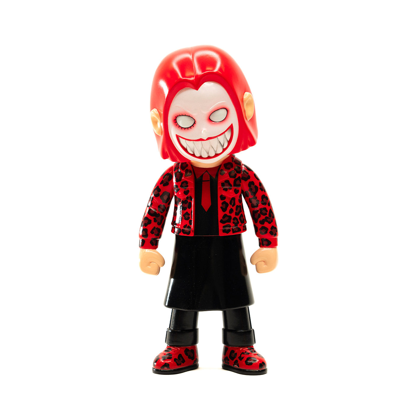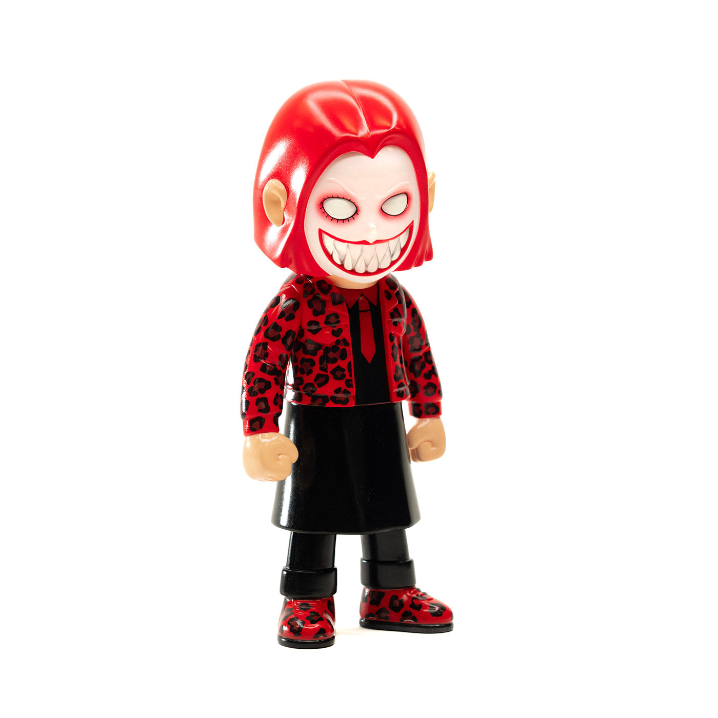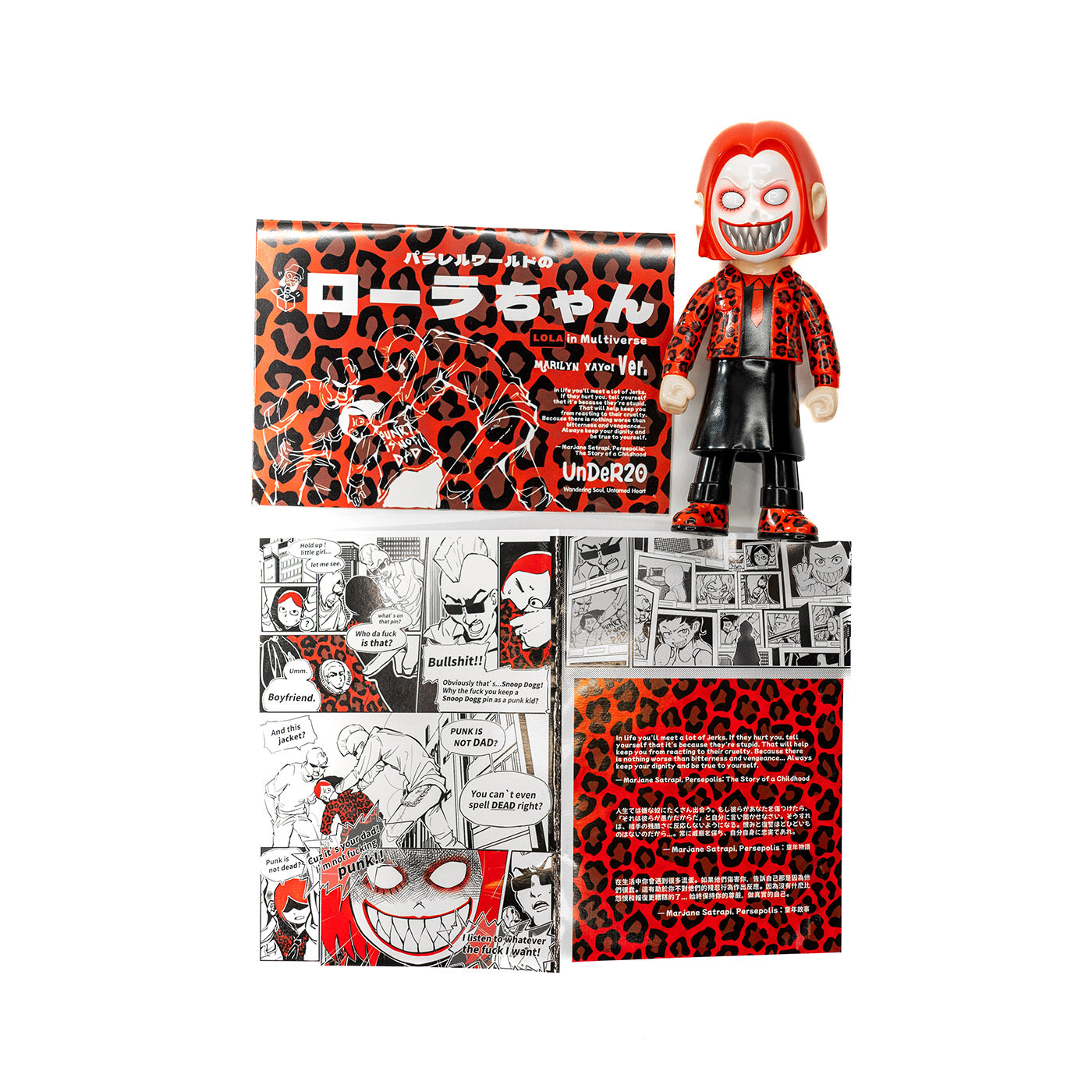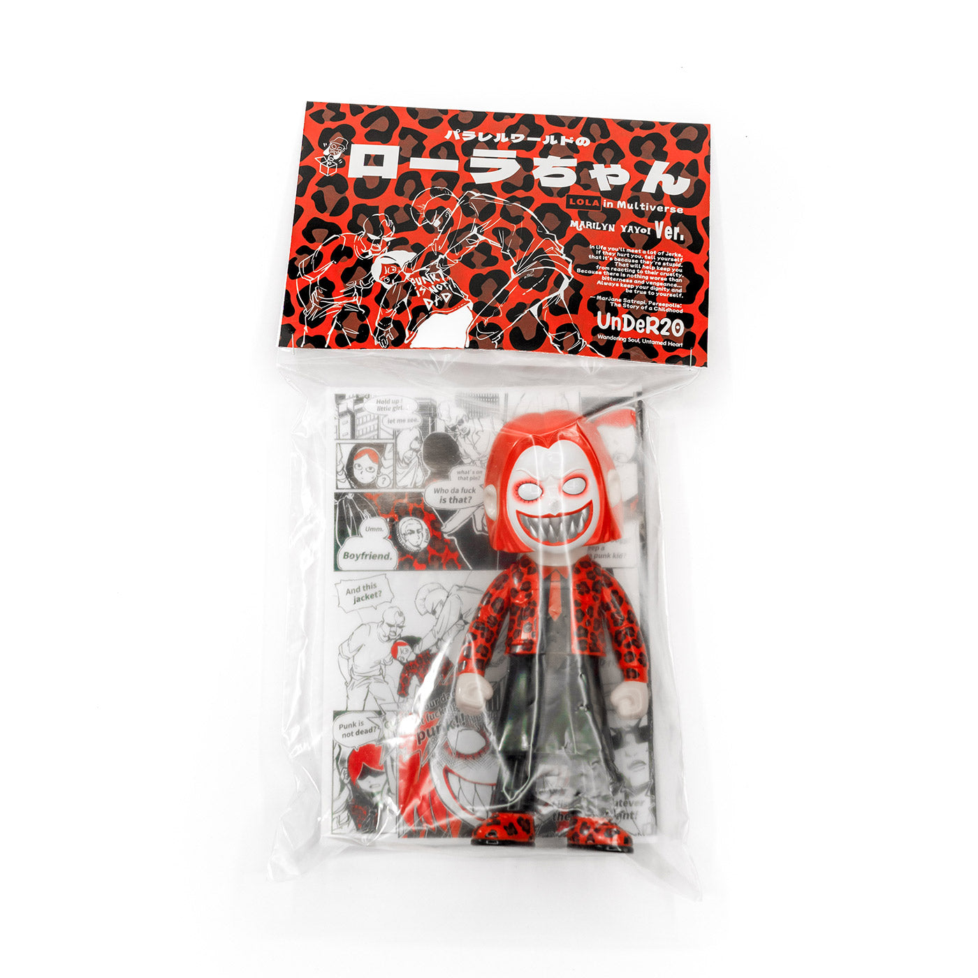 The second color scheme of the SOFUBI toy Lola in multiverse is inspired by American rock star Marilyn Manson and famous Japanese artist Yayoi Kusama. Marilyn Manson was the childhood rock music mentor of designer TenGuSan, while Yayoi Kusama is an artist with magical power. These two seemingly unrelated individuals share certain similarities, such as their strong, distinctive characters seen both in themselves and their respective works of art, as well as obsession and madness. They both have dyed their hair red, one has worn leopard print, and the other is adept with polka dots. Therefore, this Lola is named Marilyn Yayoi.