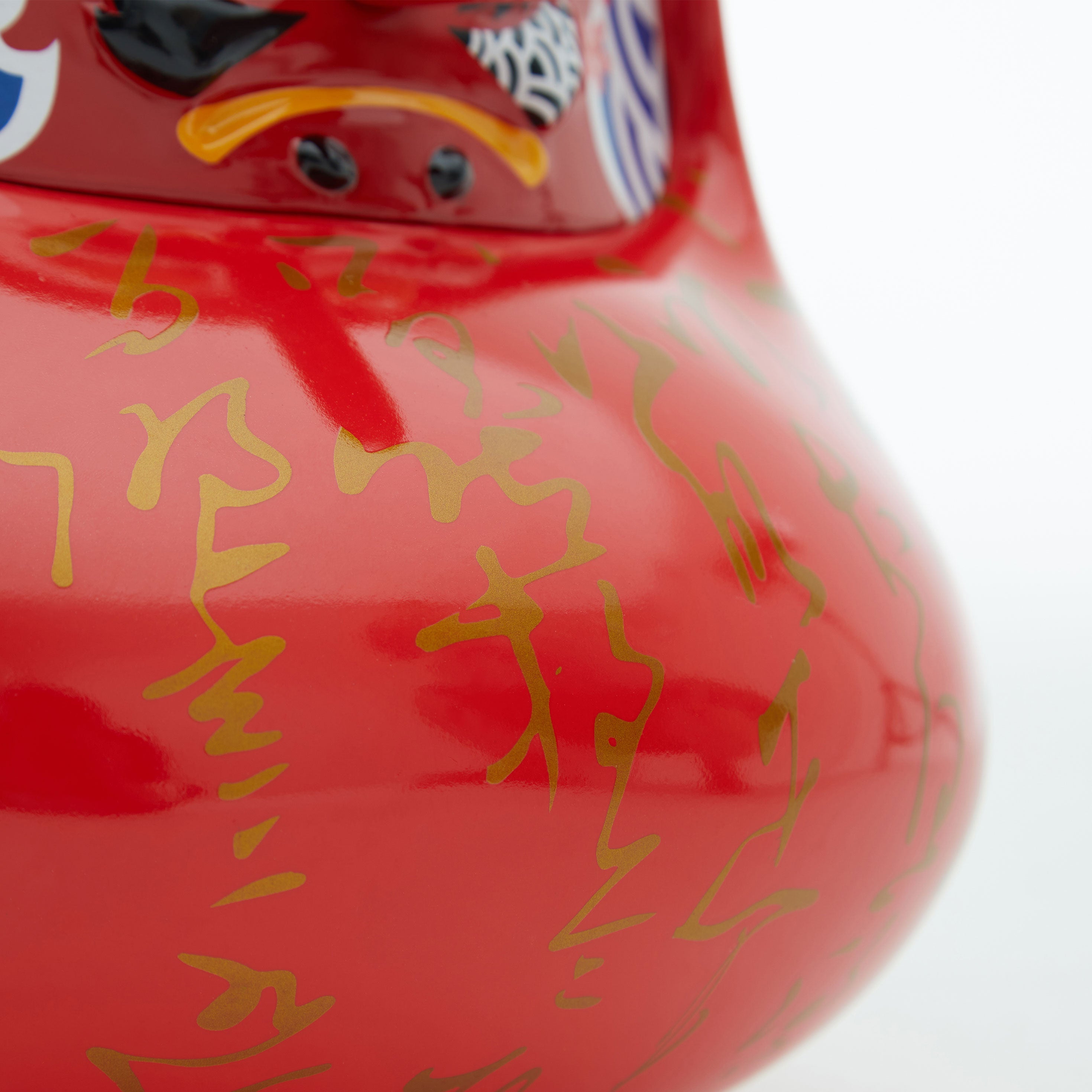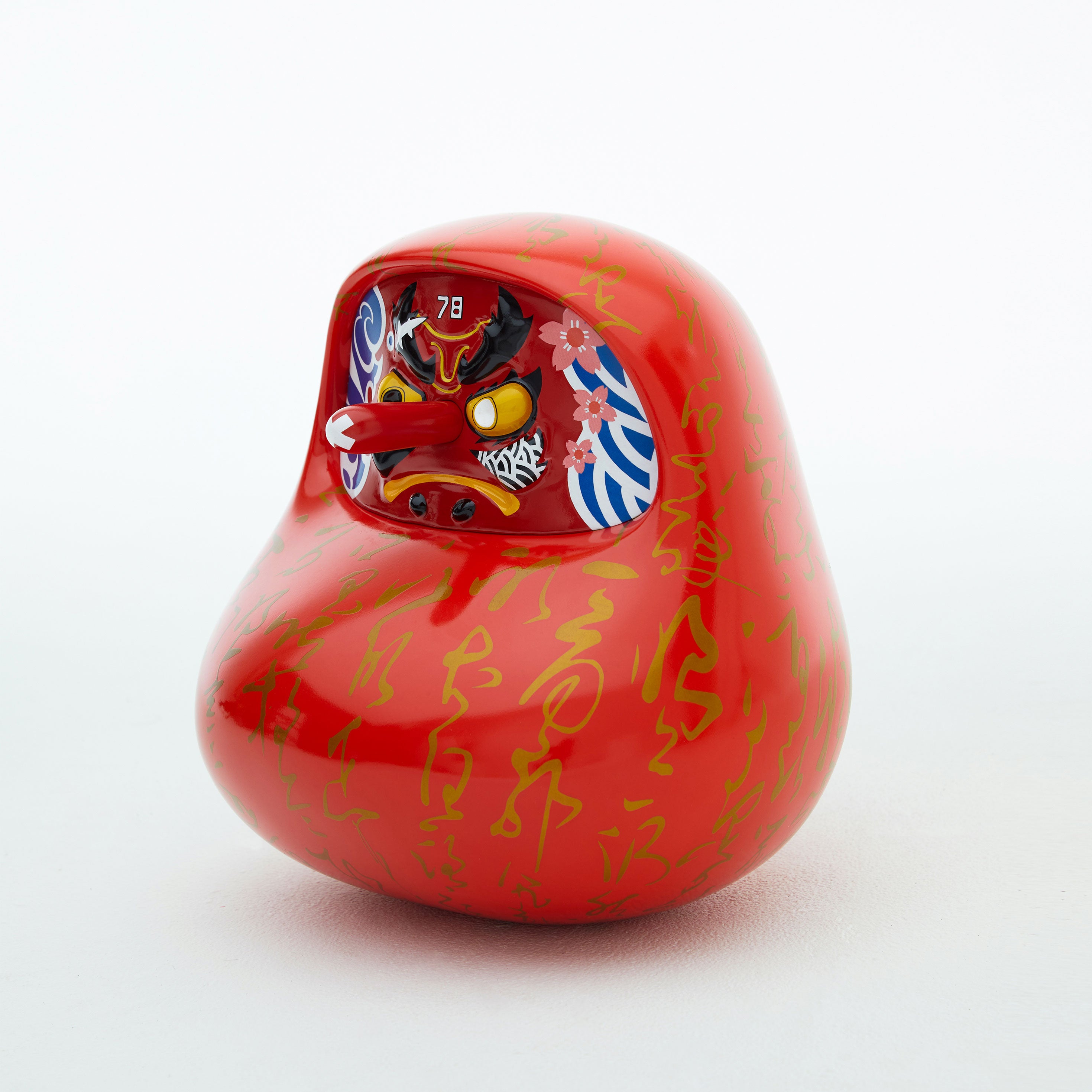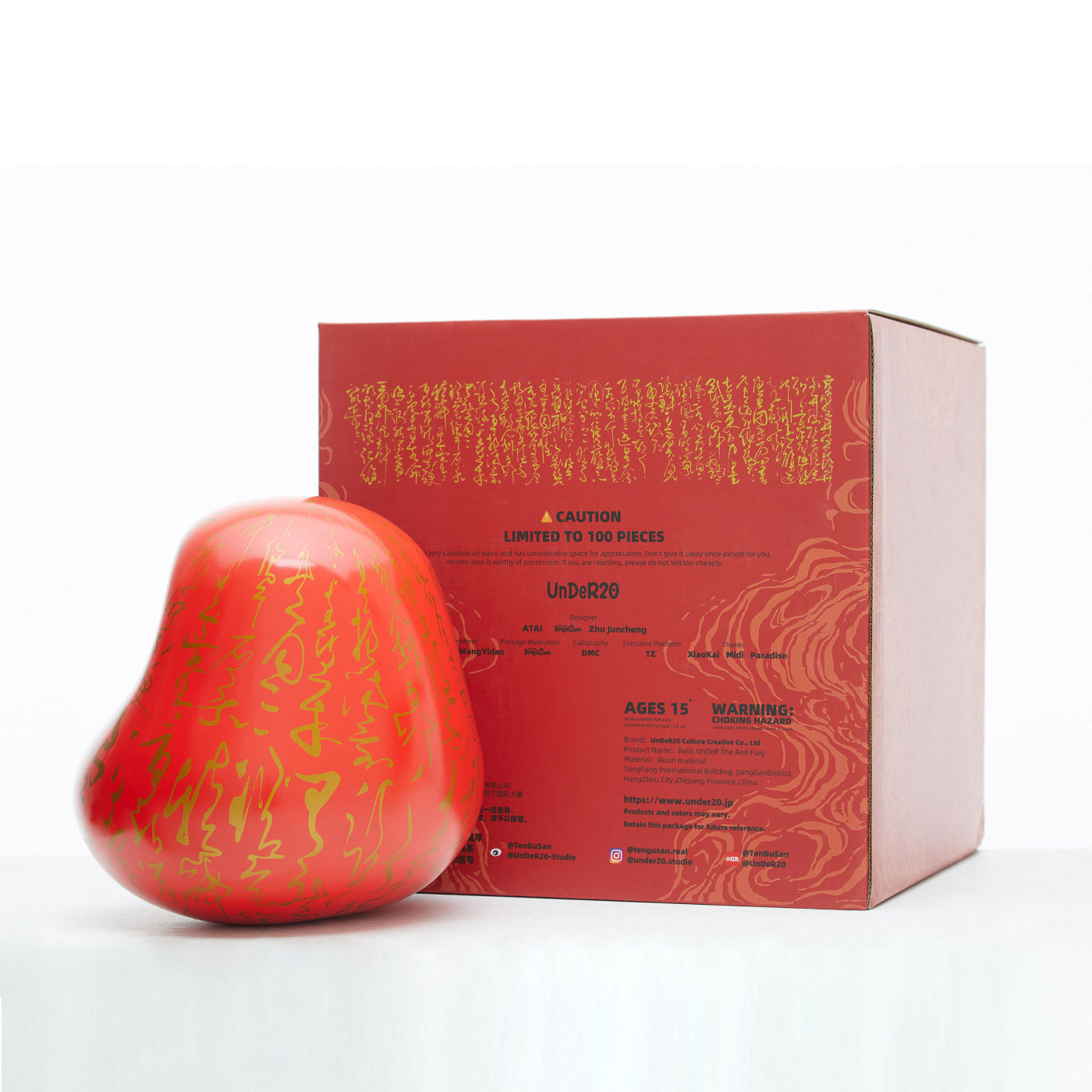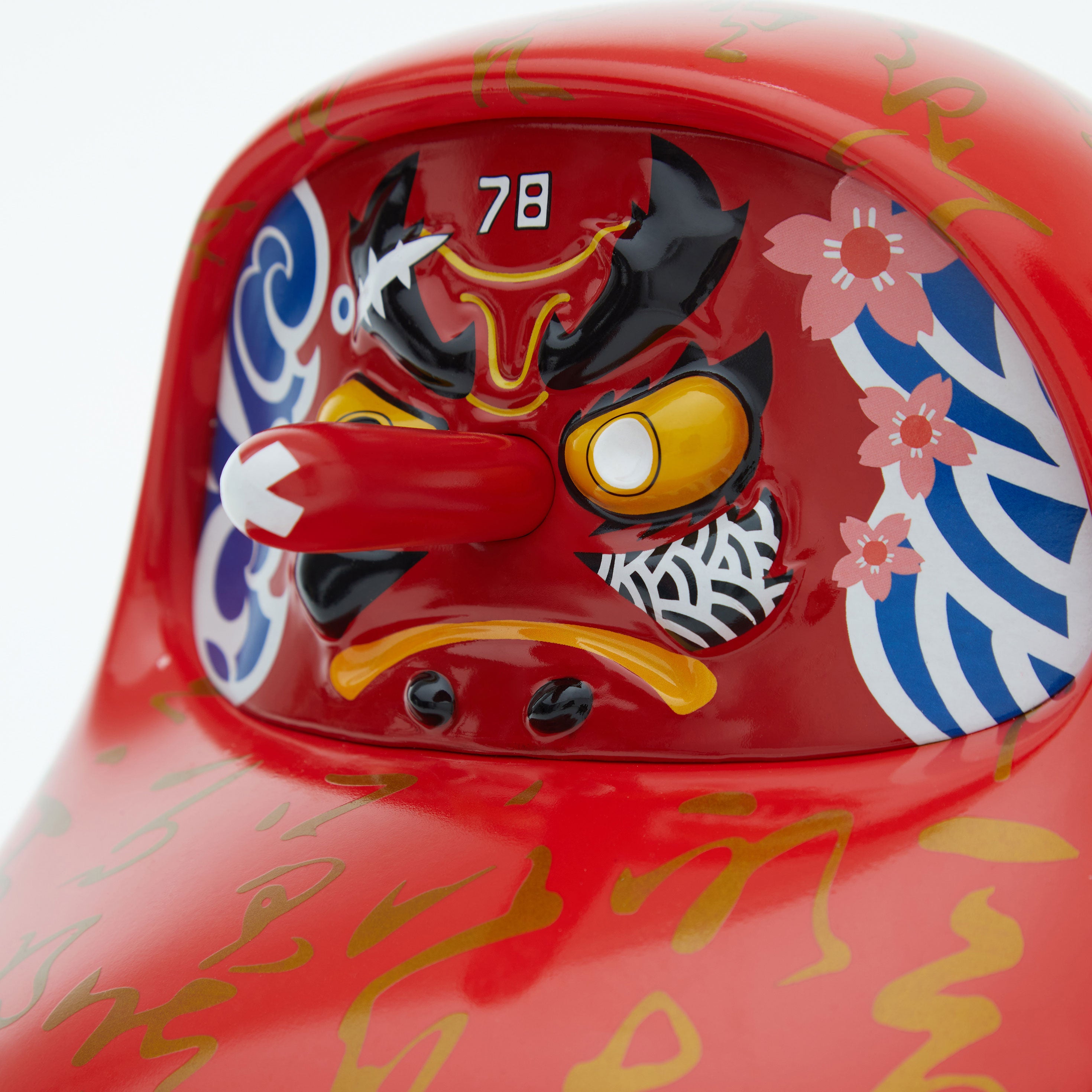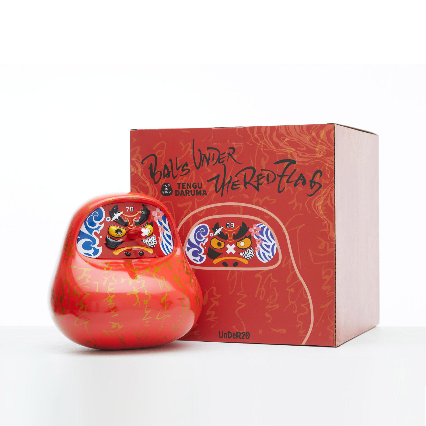 TenGuDaruma is a combination of the words "Tengu" (a monster in Japanese Myth) and "Daruma." The sculpture is named after the iconic Tengu mask and the body of Daruma, both characteristic elements of the designer, TenGuSan. Therefore, the sculpture is named TenGuDaruma - Tengu Daruma. The red spherical body of the figure resembles an egg, which brought to our minds the song "The Egg under the Red Flag" by Cui Jian, the godfather of Chinese rock. This song is Cui Jian's most radical and rebellious work, expressing his genuine inner emotions. It seemingly depicts the confusion, loss, and awakening of the people in the post-open era. The "78" on Tengu Daruma's forehead also corresponds to the historical context of that era. A calligrapher was then commissioned to write a portion of the song's lyrics in cursive script on the Daruma body, in tribute to Mr. Cui Jian. The base of Tengu Daruma features a metal coin with a unique number, signifying the uniqueness of each Tengu Daruma piece.
