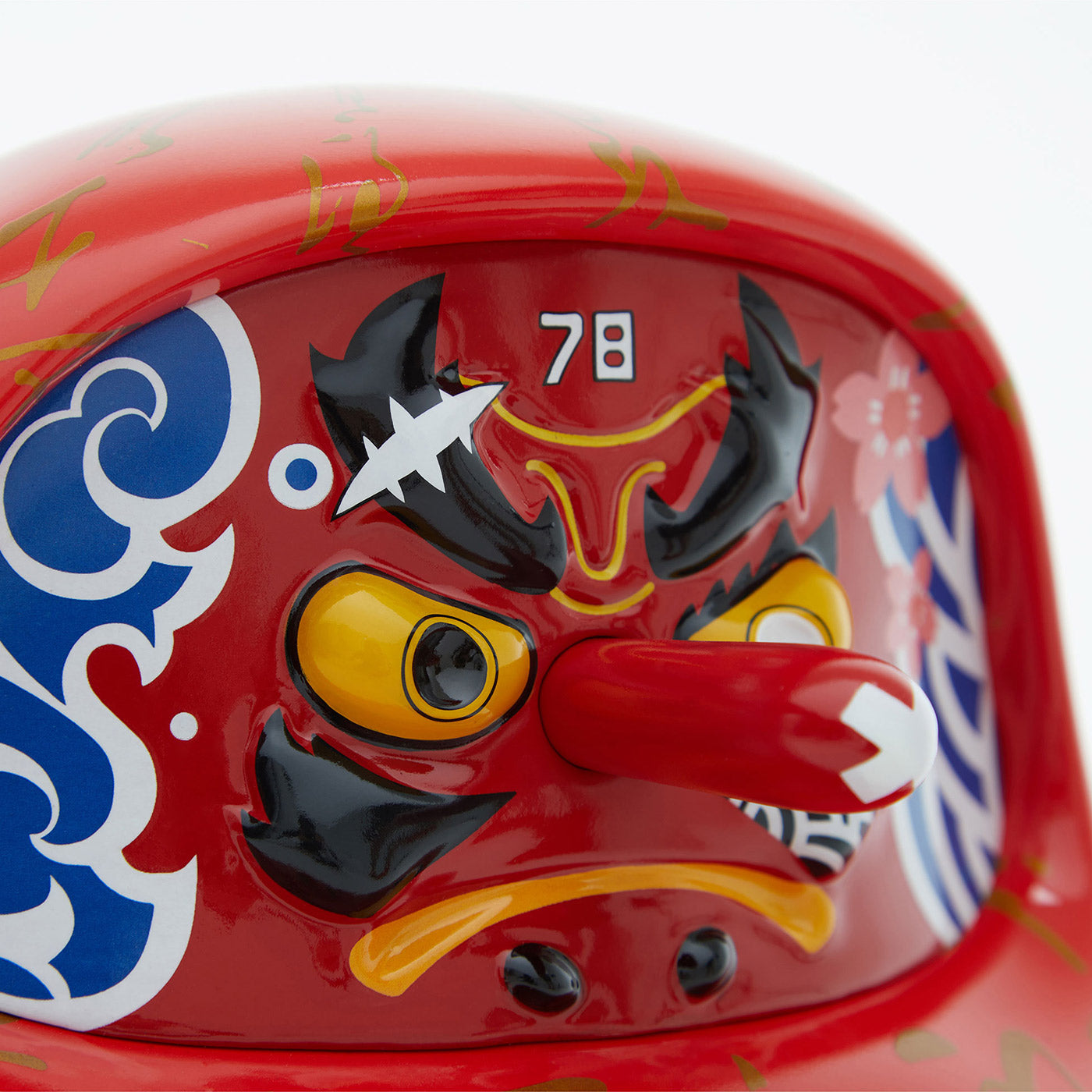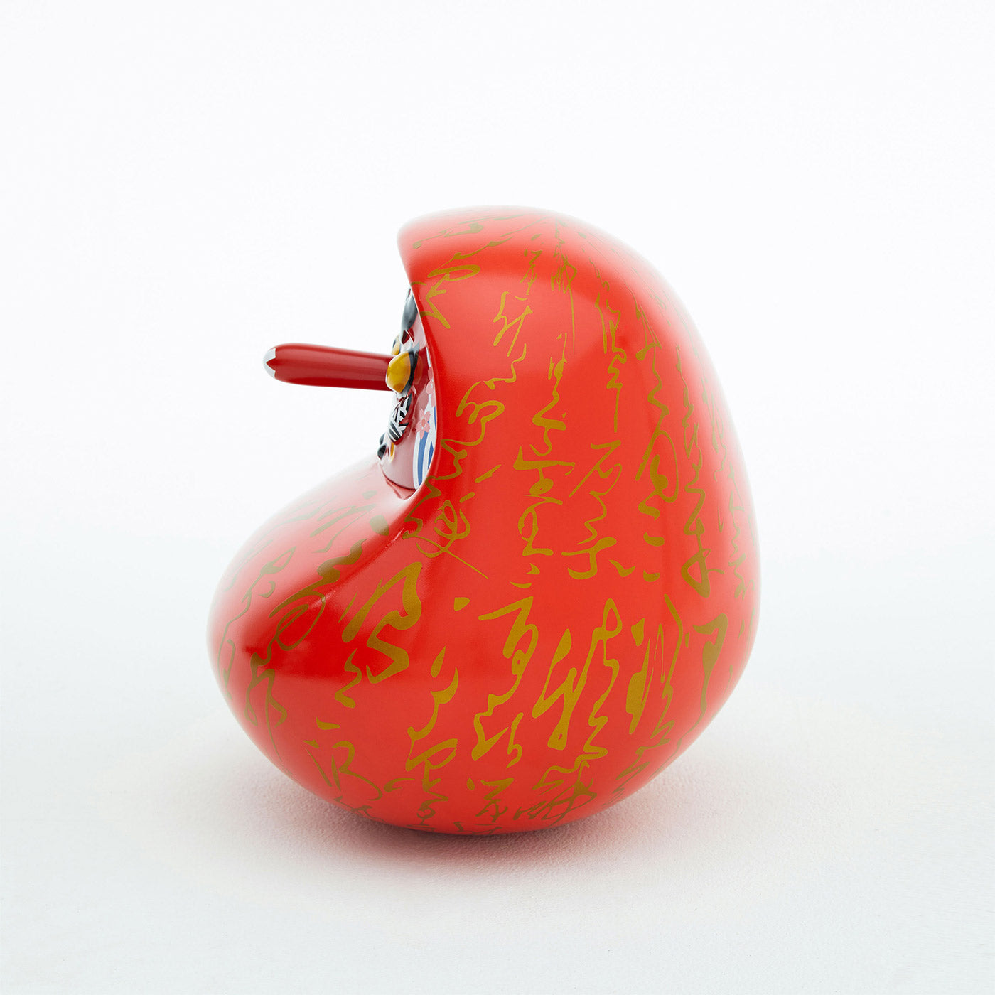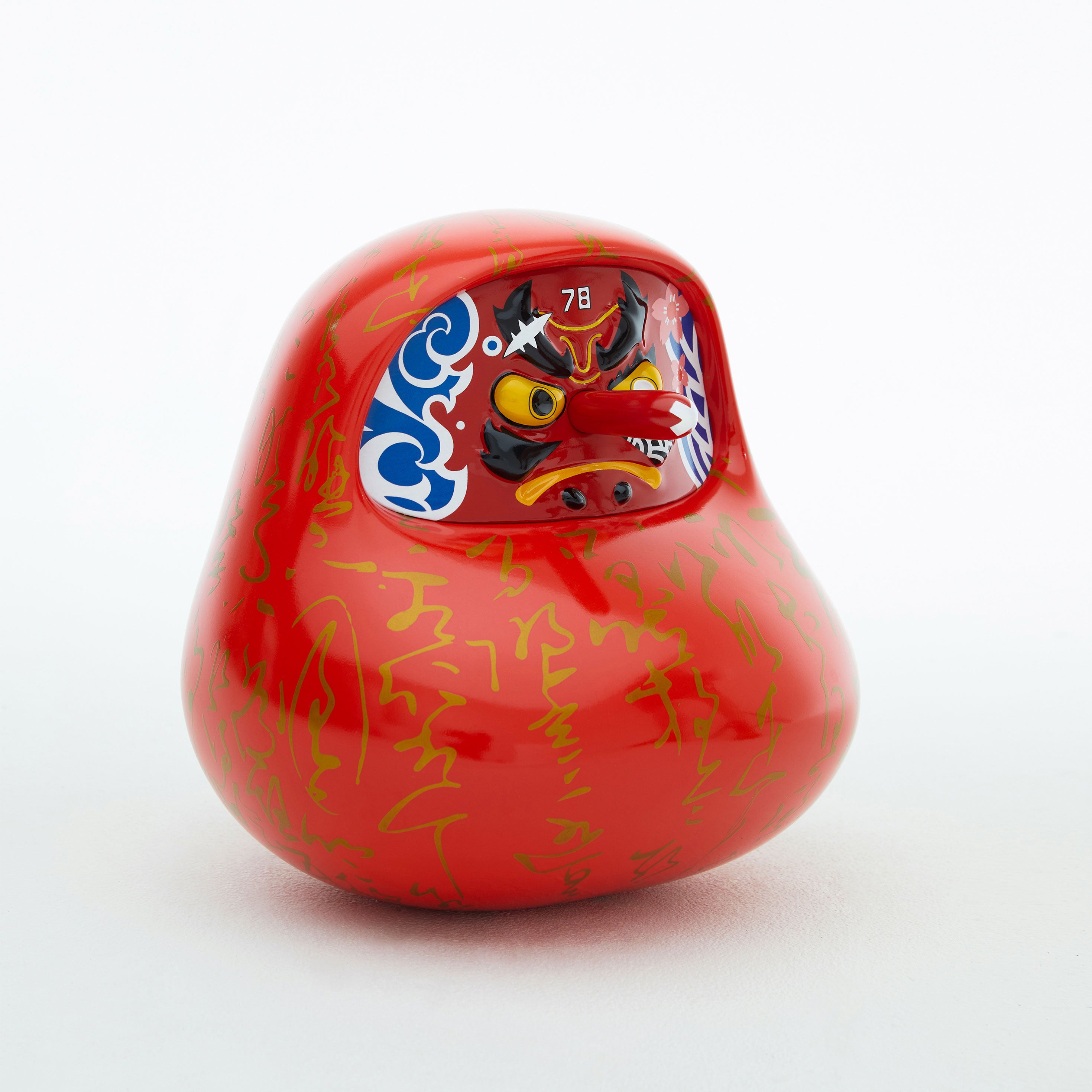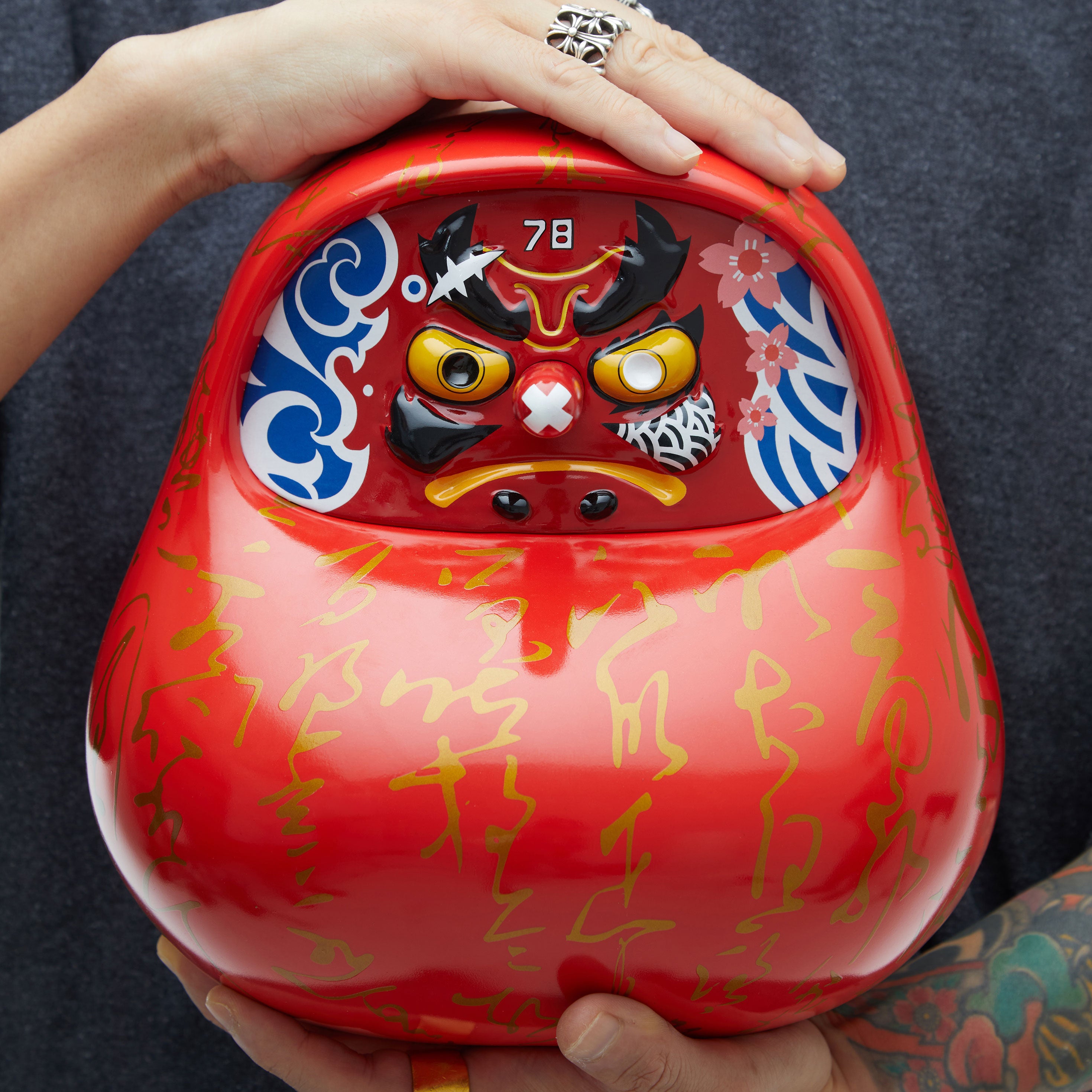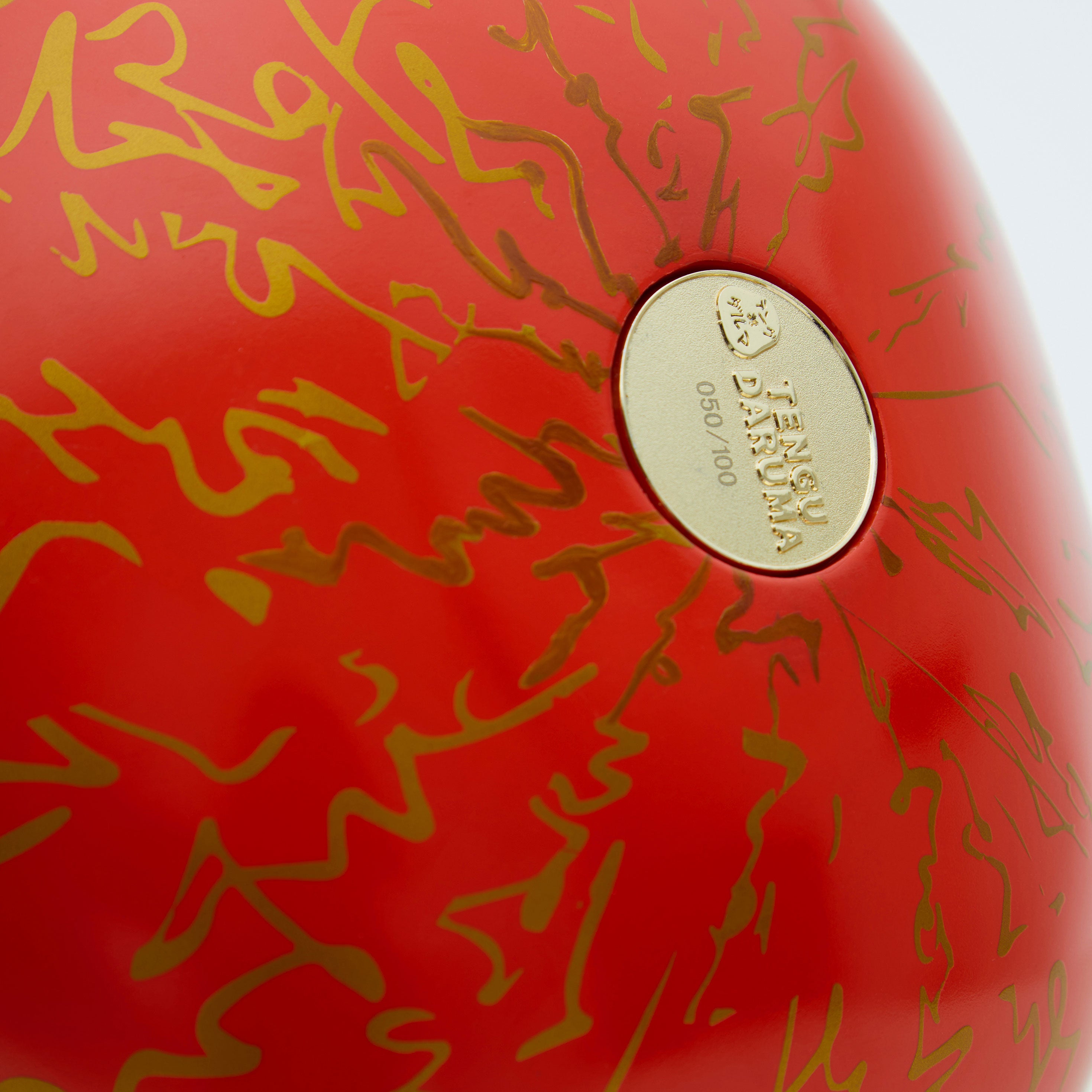 TenGuDaruma is a combination of the words "Tengu" (a monster in Japanese Myth) and "Daruma." The sculpture is named after the iconic Tengu mask and the body of Daruma, both characteristic elements of the designer, TenGuSan. Therefore, the sculpture is named TenGuDaruma - Tengu Daruma. The red spherical body of the figure resembles an egg, which brought to our minds the song "The Egg under the Red Flag" by Cui Jian, the godfather of Chinese rock. This song is Cui Jian's most radical and rebellious work, expressing his genuine inner emotions. It seemingly depicts the confusion, loss, and awakening of the people in the post-open era. The "78" on Tengu Daruma's forehead also corresponds to the historical context of that era. A calligrapher was then commissioned to write a portion of the song's lyrics in cursive script on the Daruma body, in tribute to Mr. Cui Jian. The base of Tengu Daruma features a metal coin with a unique number, signifying the uniqueness of each Tengu Daruma piece.