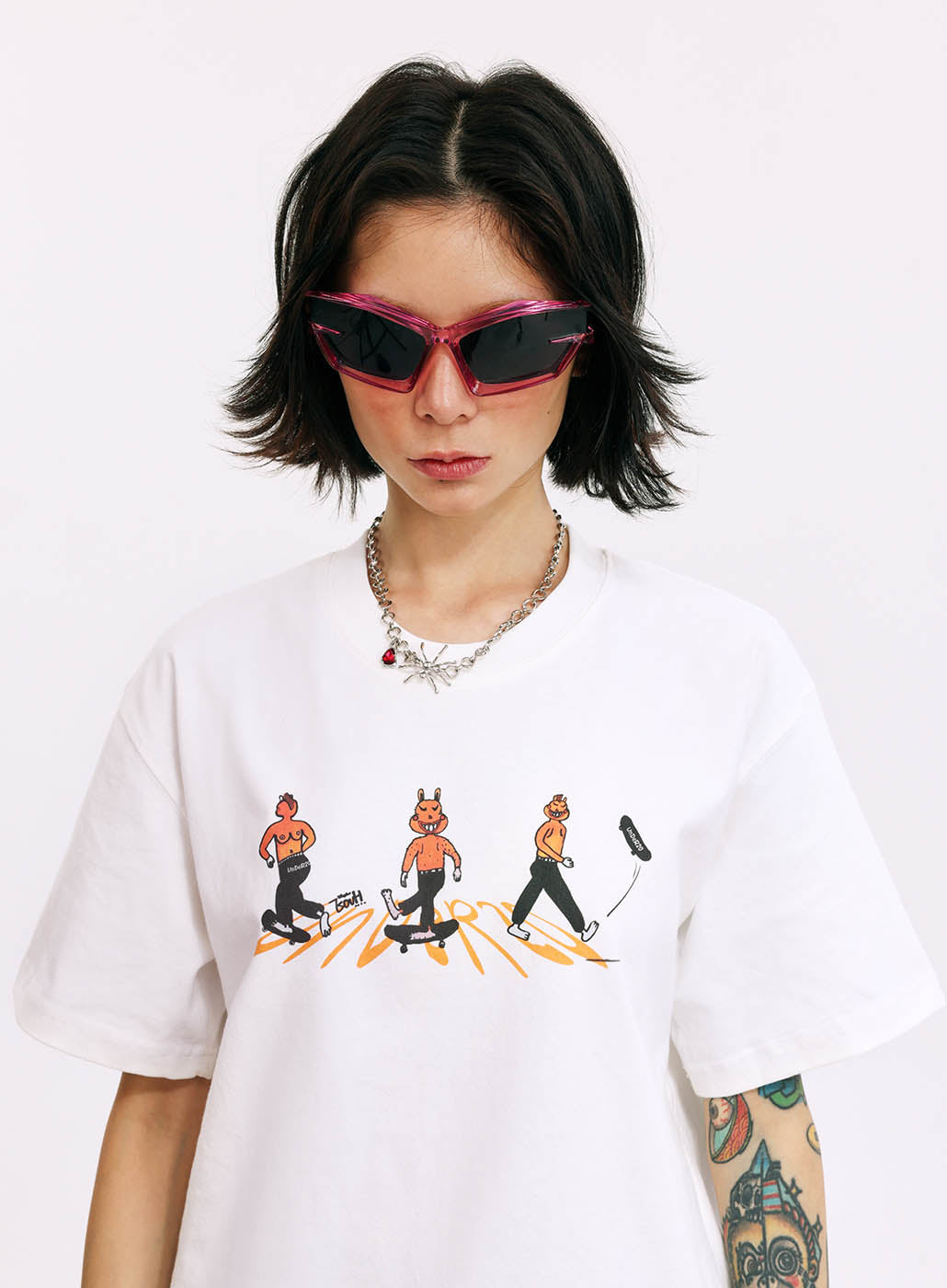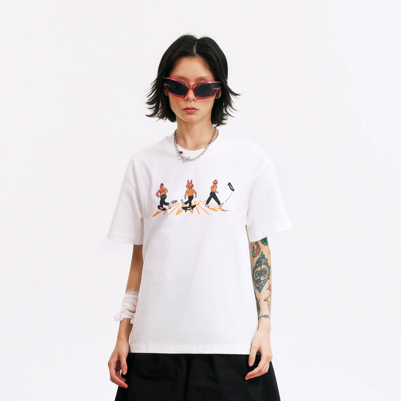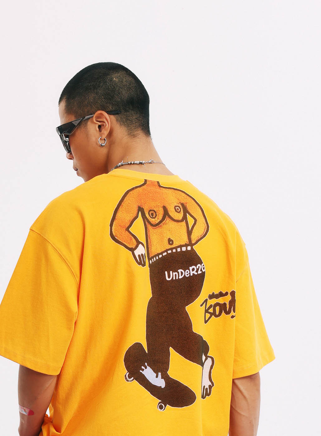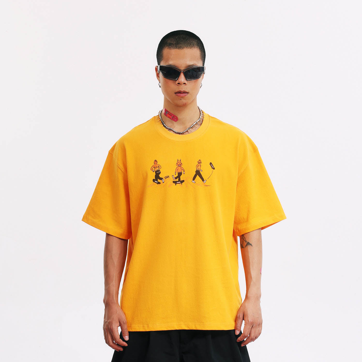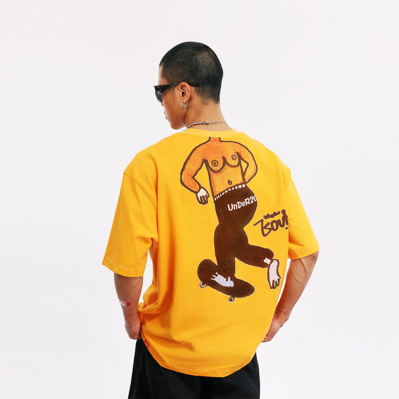 Tailer is an undeniably rebellious boy within the family, with a Mohawk and a bare back revealing breasts, clearly showing ambiguous sexual characteristics. Notoriously, he's the most mischievous local skateboarder, renowned for his precise shooting. The artist EouH portrays Tailer as a character both cute and cool. Thus, we boldly feature a large print on the back of this T-shirt, dedicated to the coolest individuals.